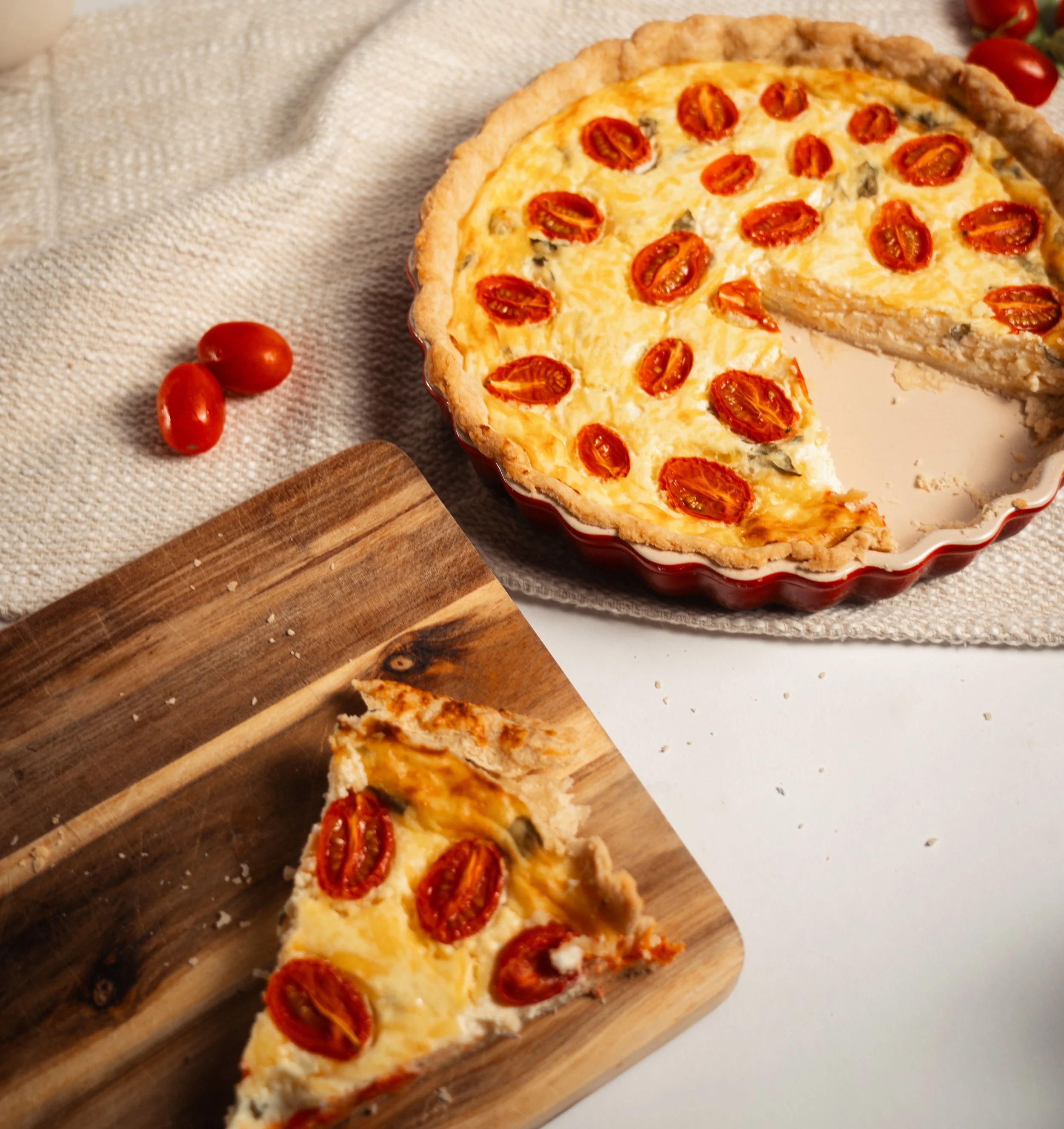 Tomato Basil Tart The Tomato Basil Tart is a cheesy mixture topped with fresh tomatoes and basil that are perfectly paired with the traditional crust recipe. This tart is excellent for breakfast, dinner or any brunch occasion for friends and family. Order Now